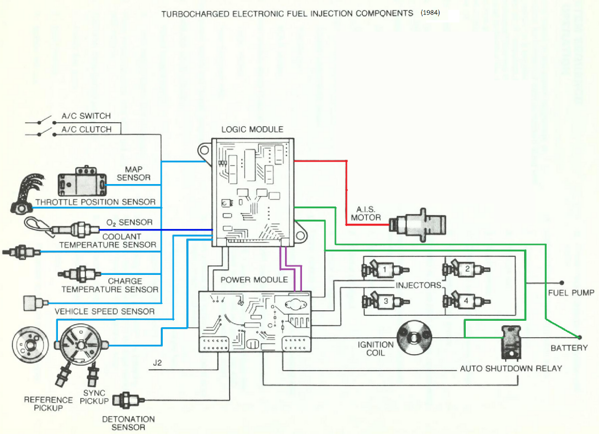 Működtető elem elég kevés van. Az üzemanyag állandó nyomással éri el az injektorokat, a befecskendezett mennyiséget a nyitási idő beállításával szabályozza (vagy vezérli) a számítógép. Van még egy gyújtó trafó, és az alapjárati motor (Automatic Idle Speed motor) mely a pillangószelepet megkerülő levegő mennyiségét tudja változtatni. Ilyen egyszerű. Ha jobban megnézzük még egyszerűbb. A négy injektort nem külön-külön kapcsolja a számítógép, hanem párosával (batch-fire módban). Erre elég a számítási teljesítmény. Az ASD (Auto ShutDown) relé biztosítja a benzin szivattyú, a gyújtó trafó, az injektorok tápellátását, amikor levesszük a gyújtást, nem lesz se benzin, se szikra.